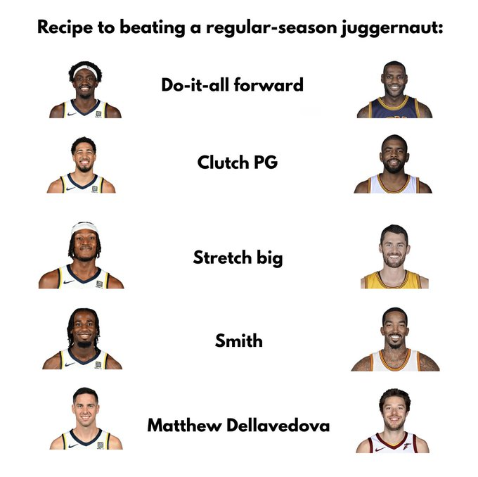 赛后,美媒NBA Memes更新社媒晒步行者与2016年夺冠骑士阵容的相似程度,两队阵中都拥有:全能型前锋、关键时刻表现出色的控球后卫、具备外线投射能力的传统内线球员、叫史密斯的球员、像德拉瓦多瓦一样的拼命三郎。